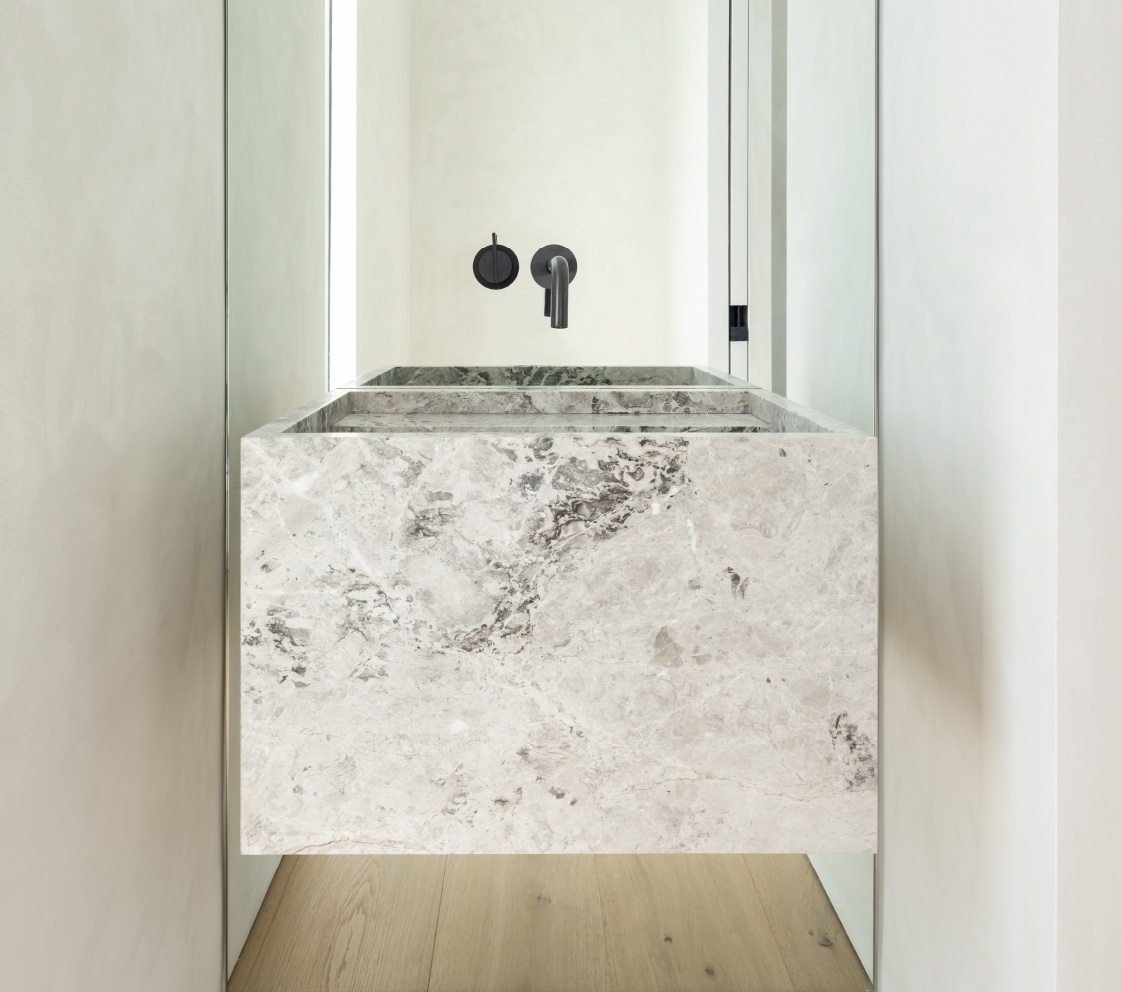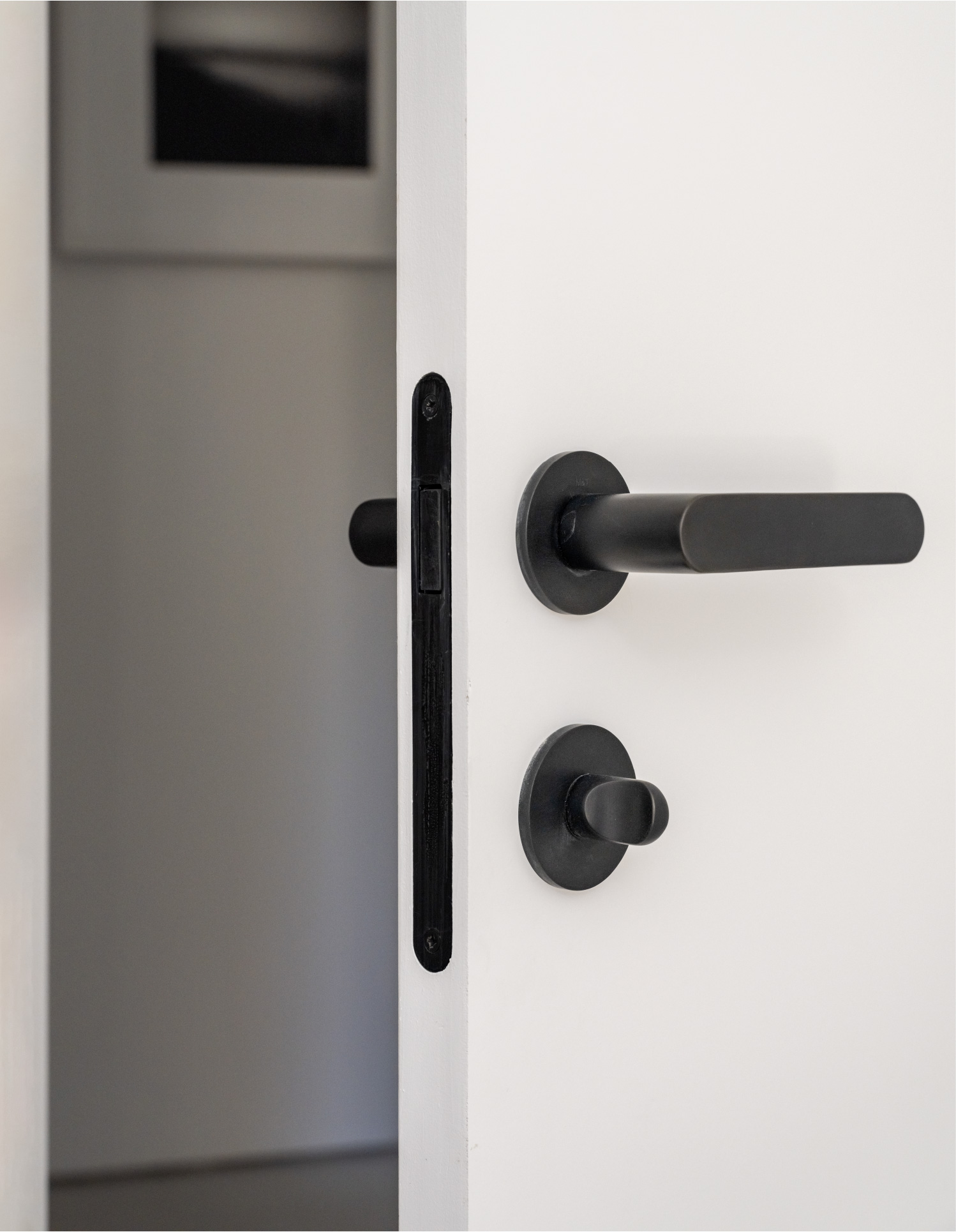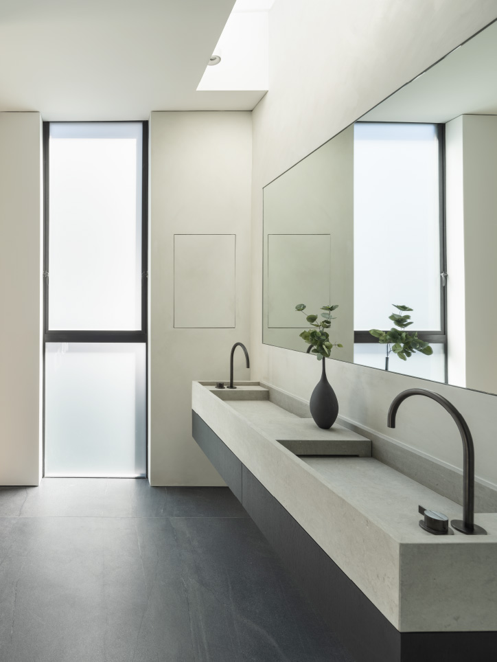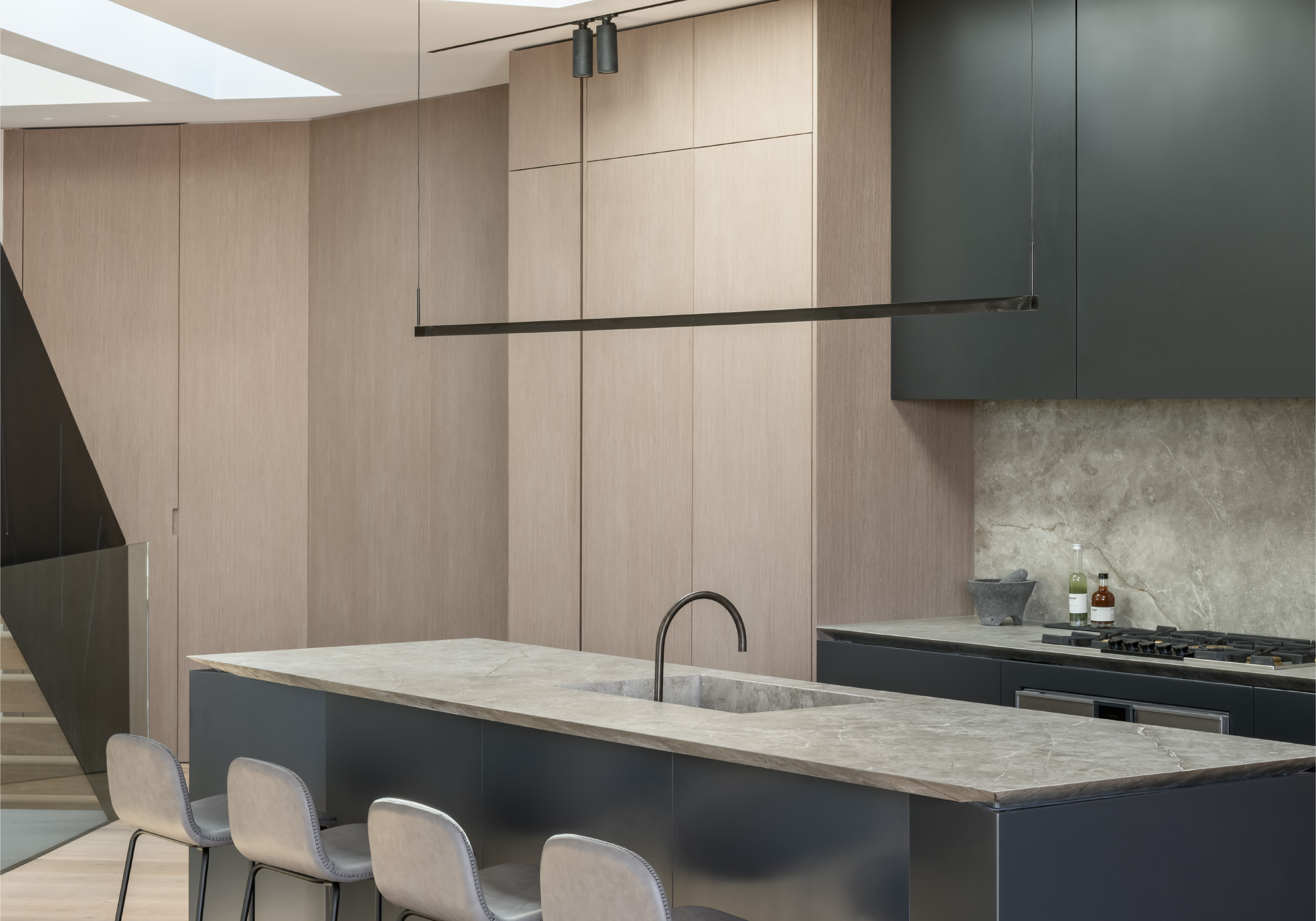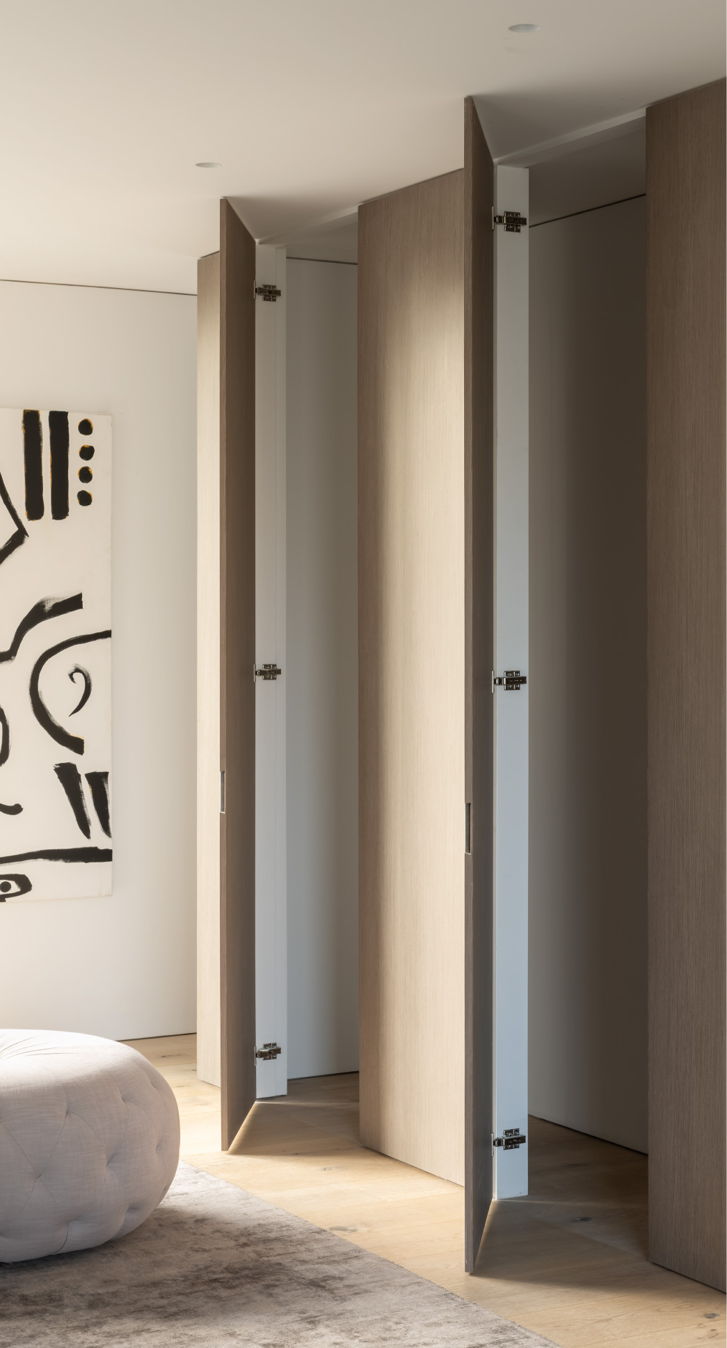 This hardware combined with custom flush-with-the wall concealed hinge doors that span from floor-to ceiling and feature true trim less jambs.