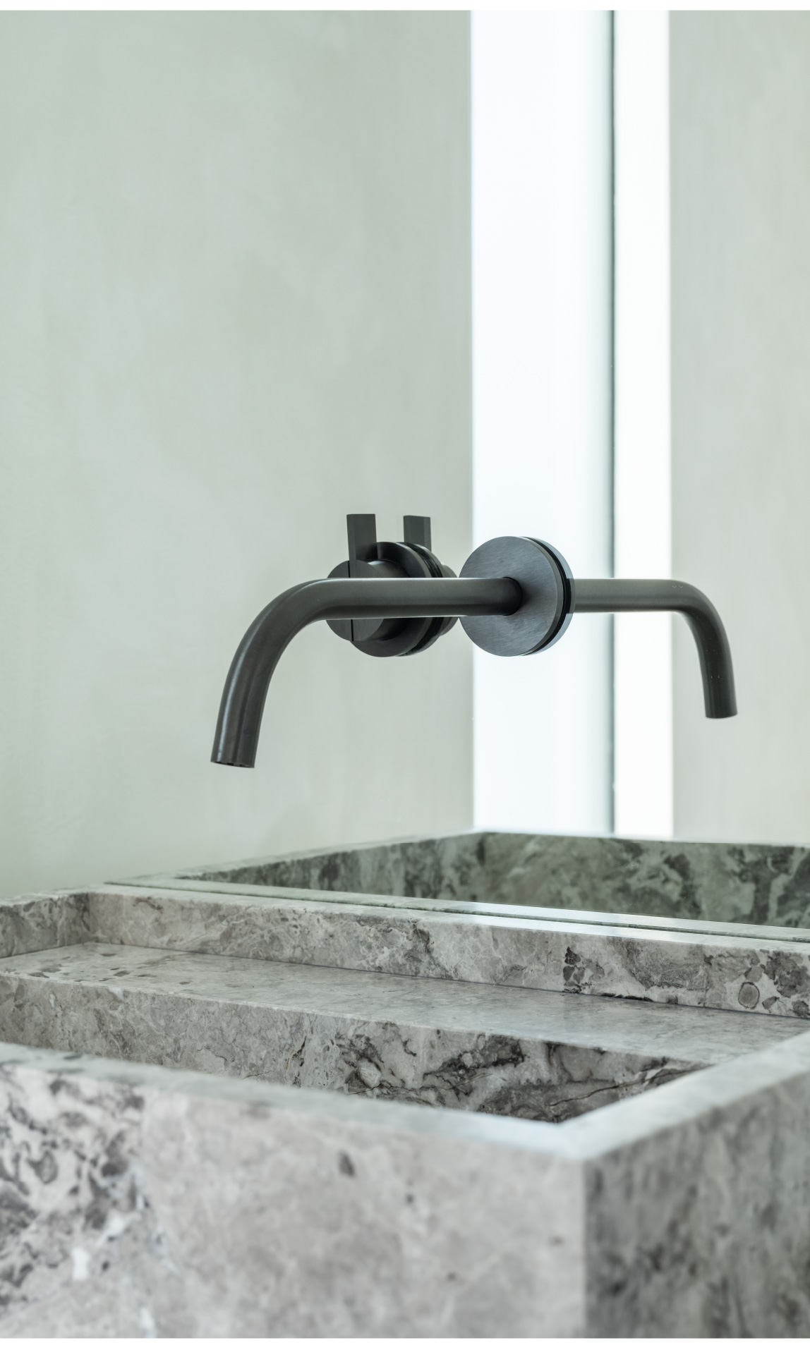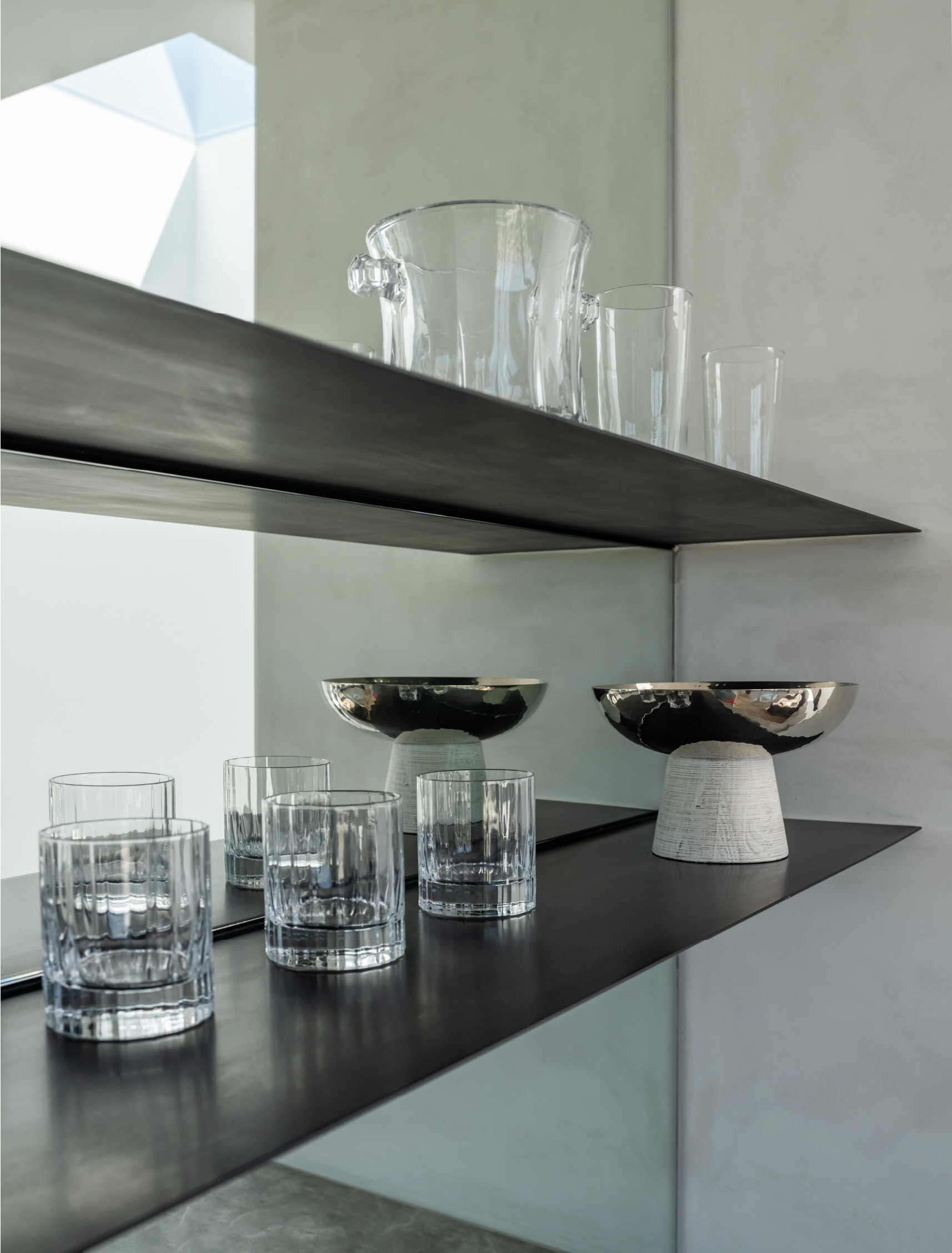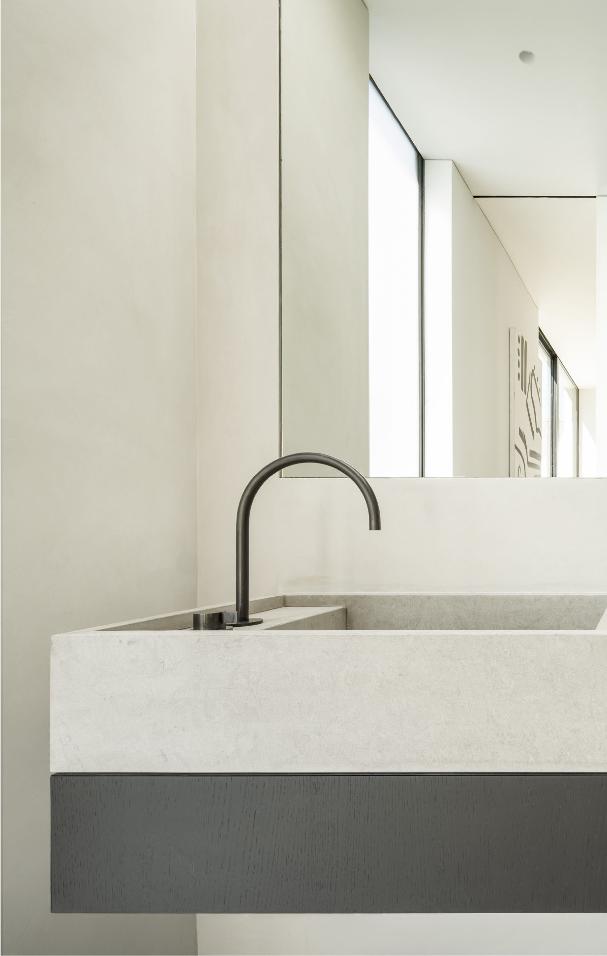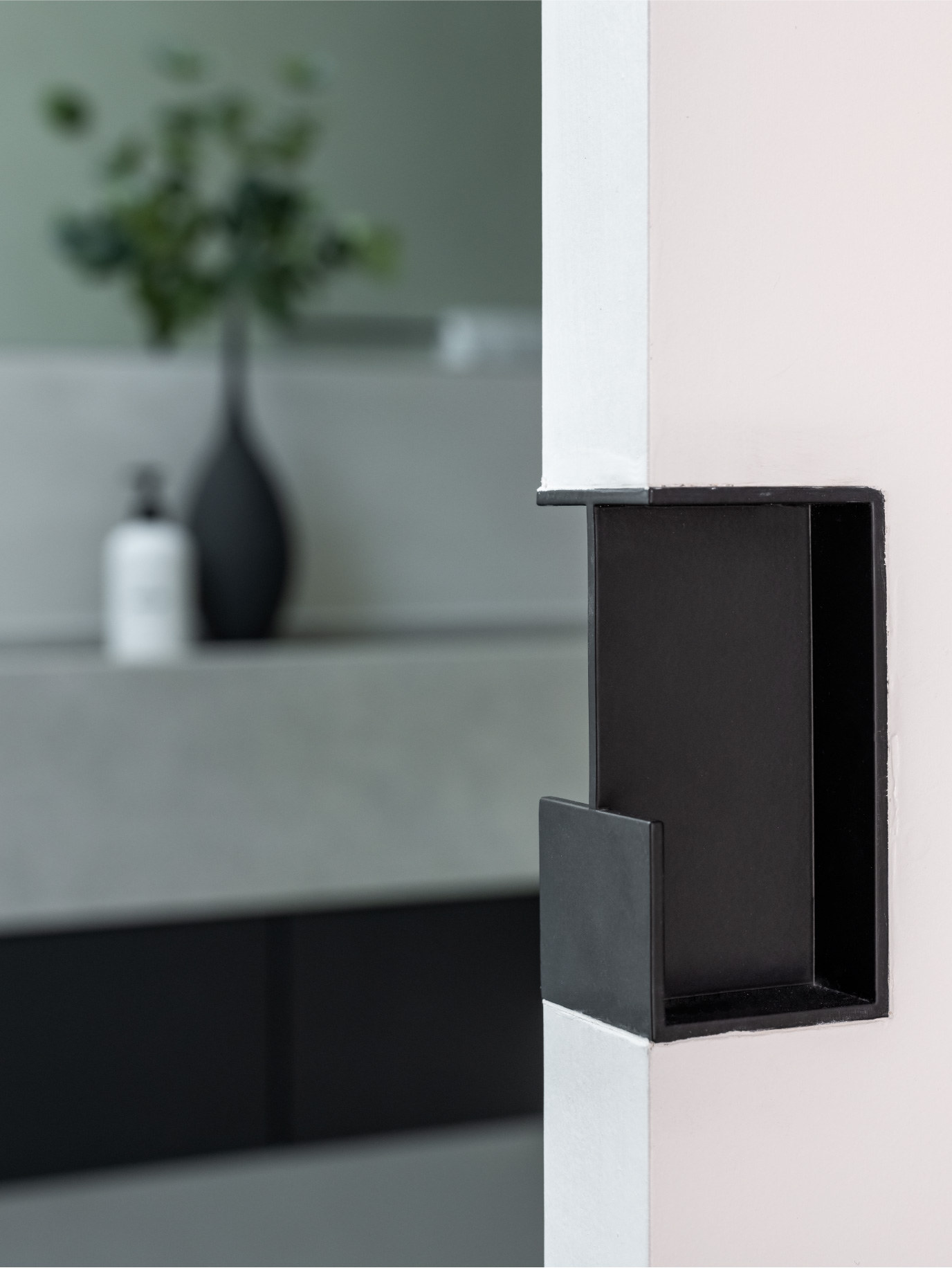 This hardware combined with custom flush-with-the wall concealed hinge doors that span from floor-to ceiling and feature true trim less jambs.