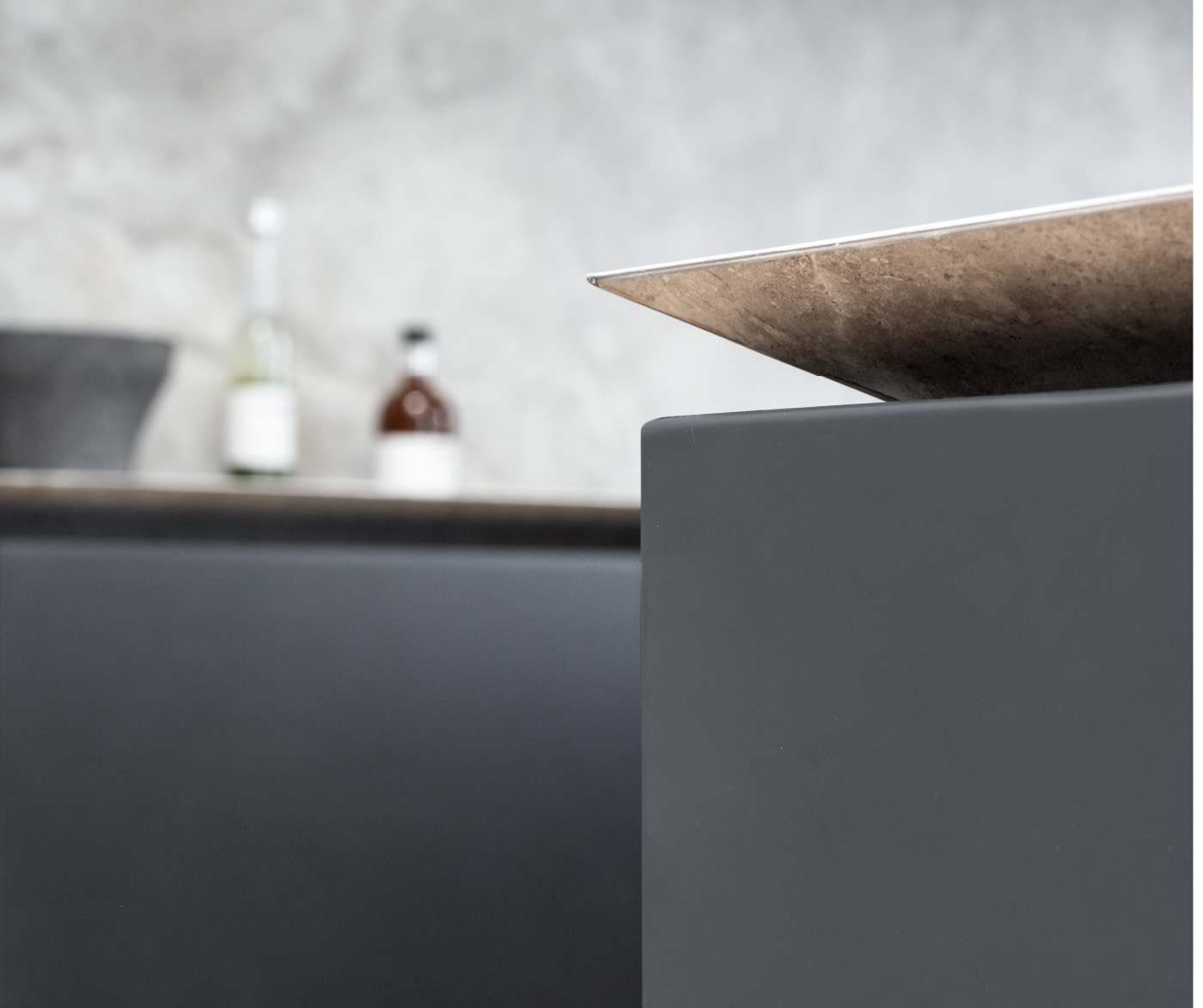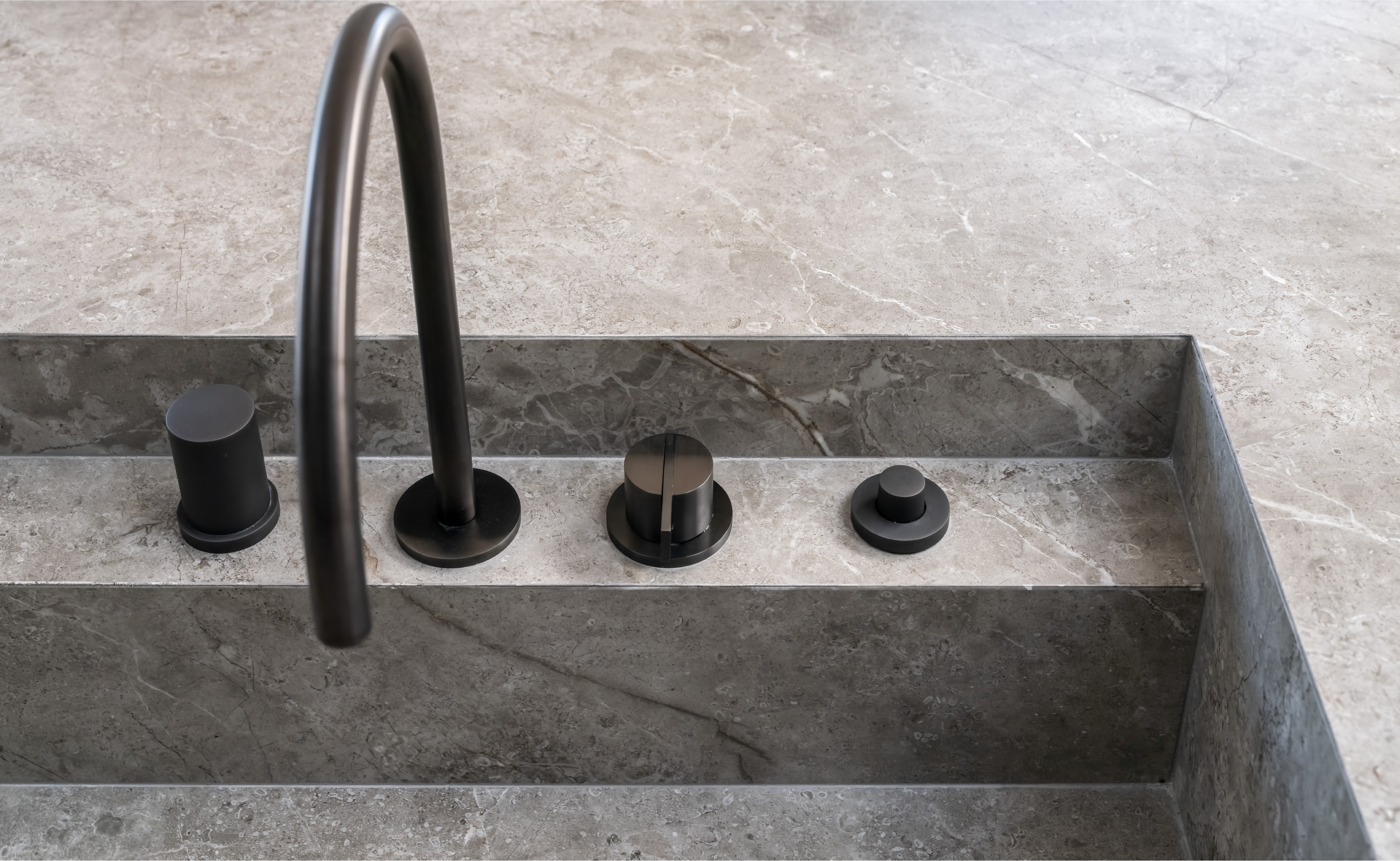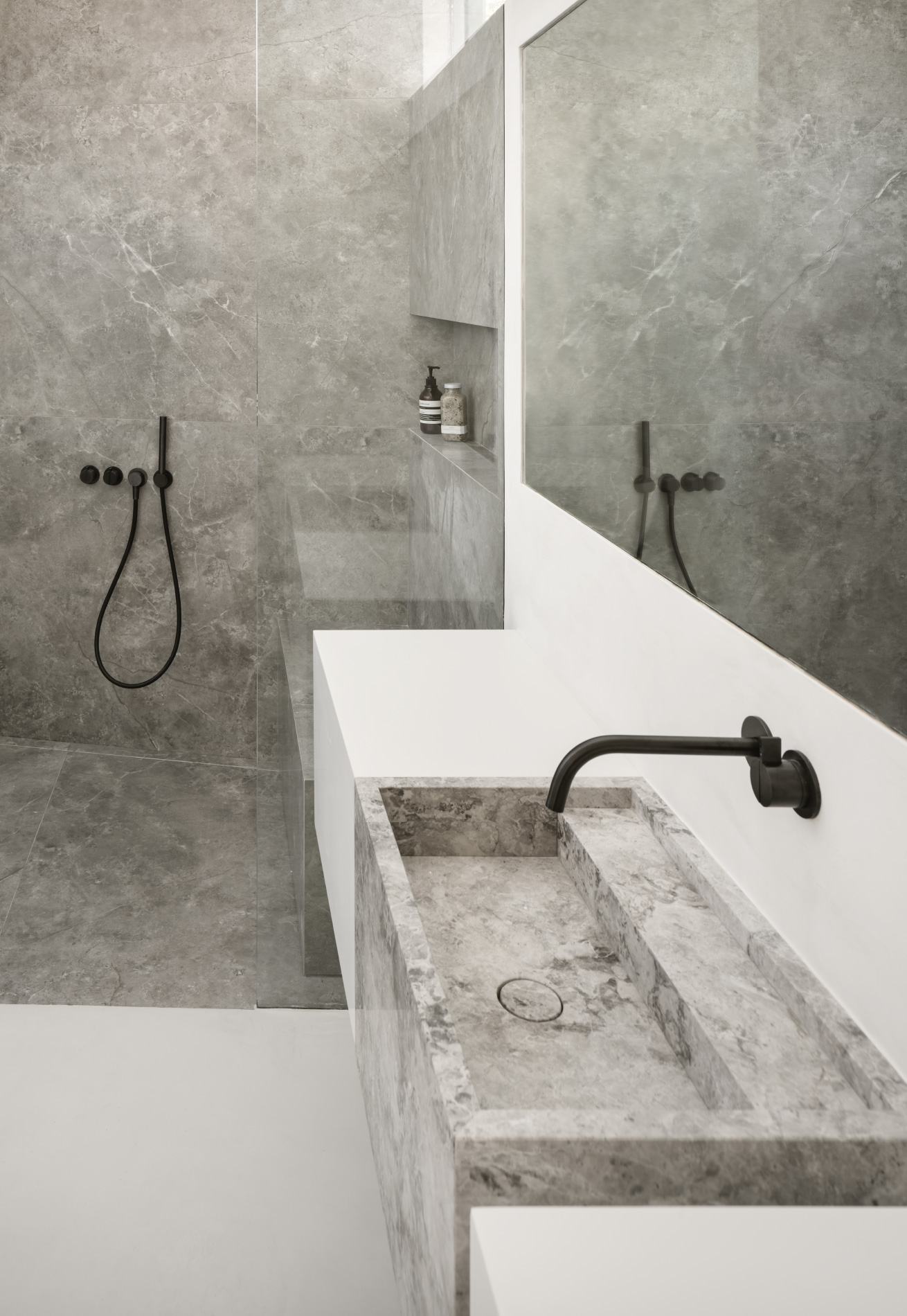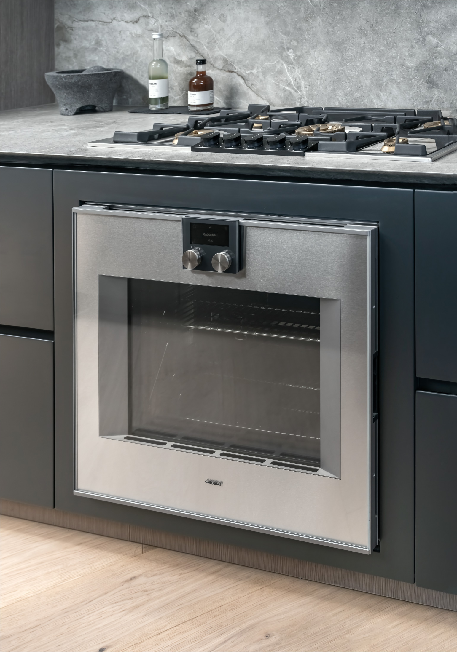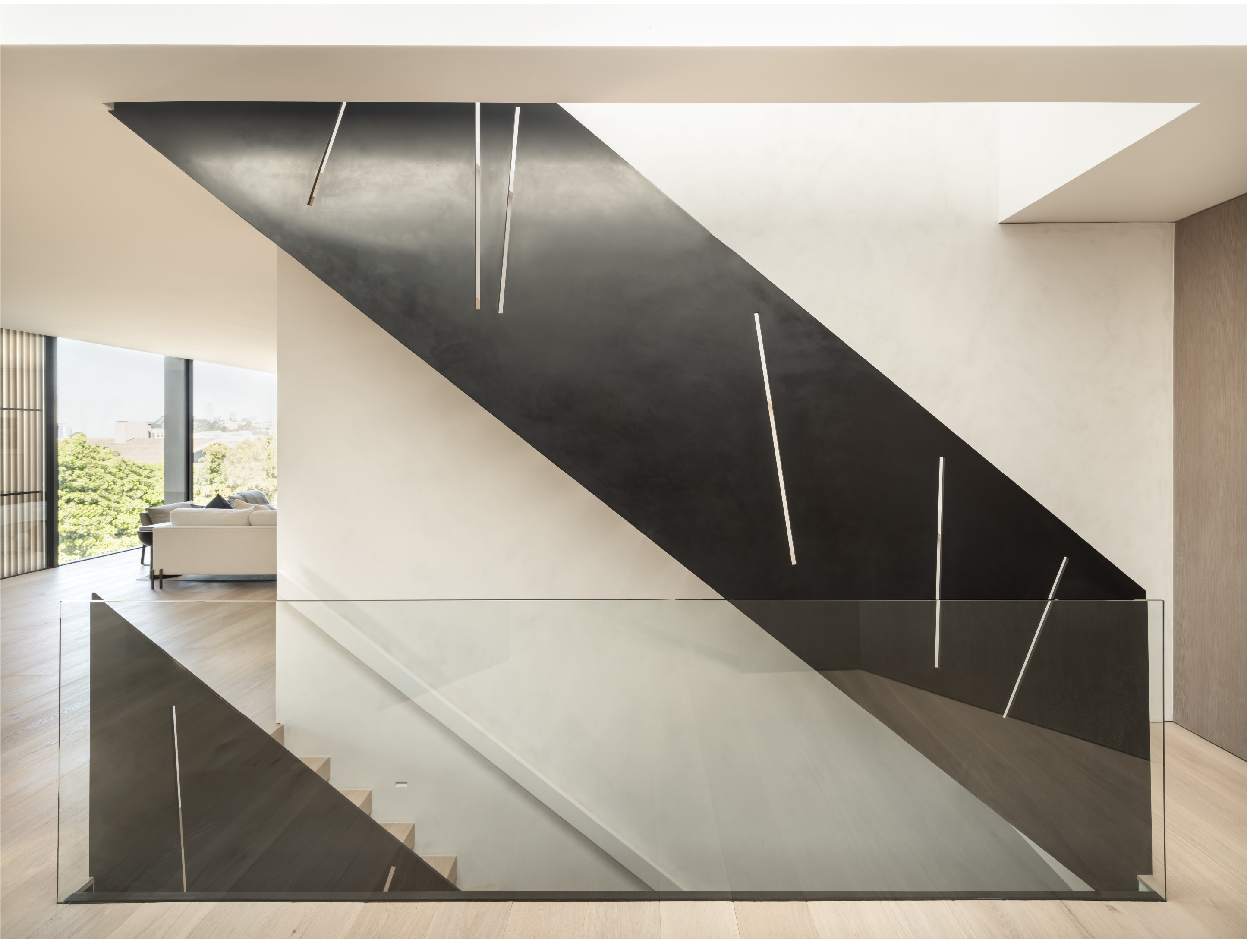 This hardware combined with custom flush-with-the wall concealed hinge doors that span from floor-to ceiling and feature true trim less jambs.